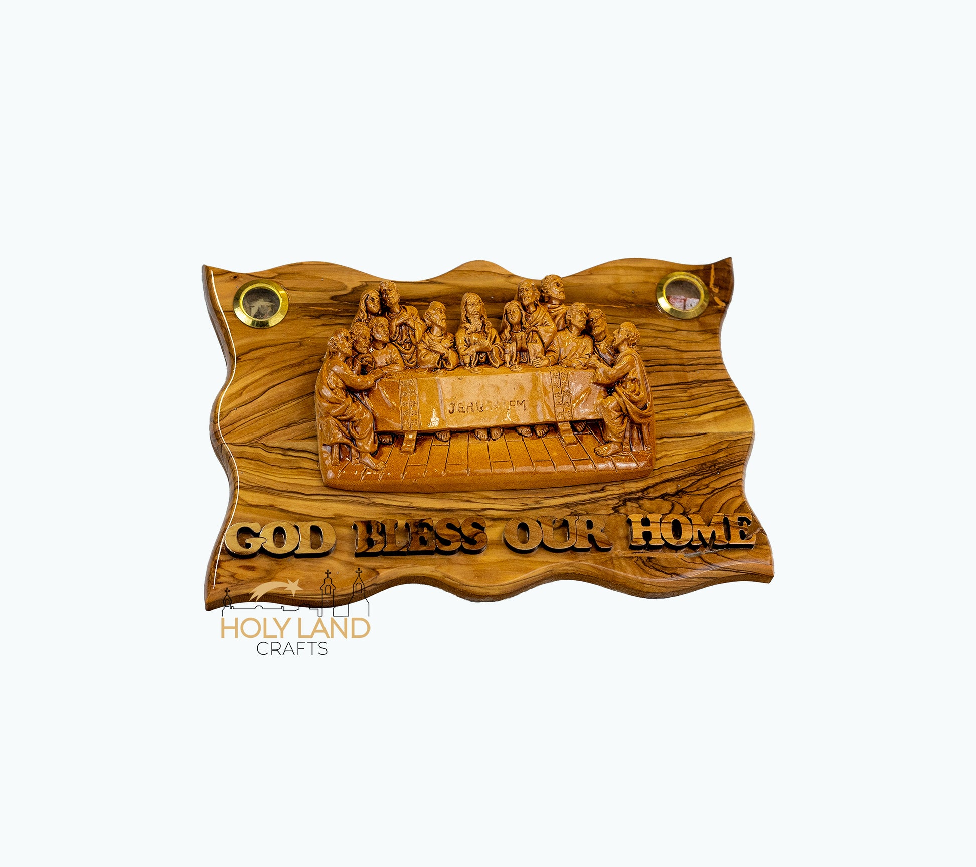 Hand crafted olive wood wall plaque. Last supper Made from ceramic. Made by Christian artisans in Bethlehem. contains olive branch from the gethsemane garden and incense from the nativity church of Bethlehem.