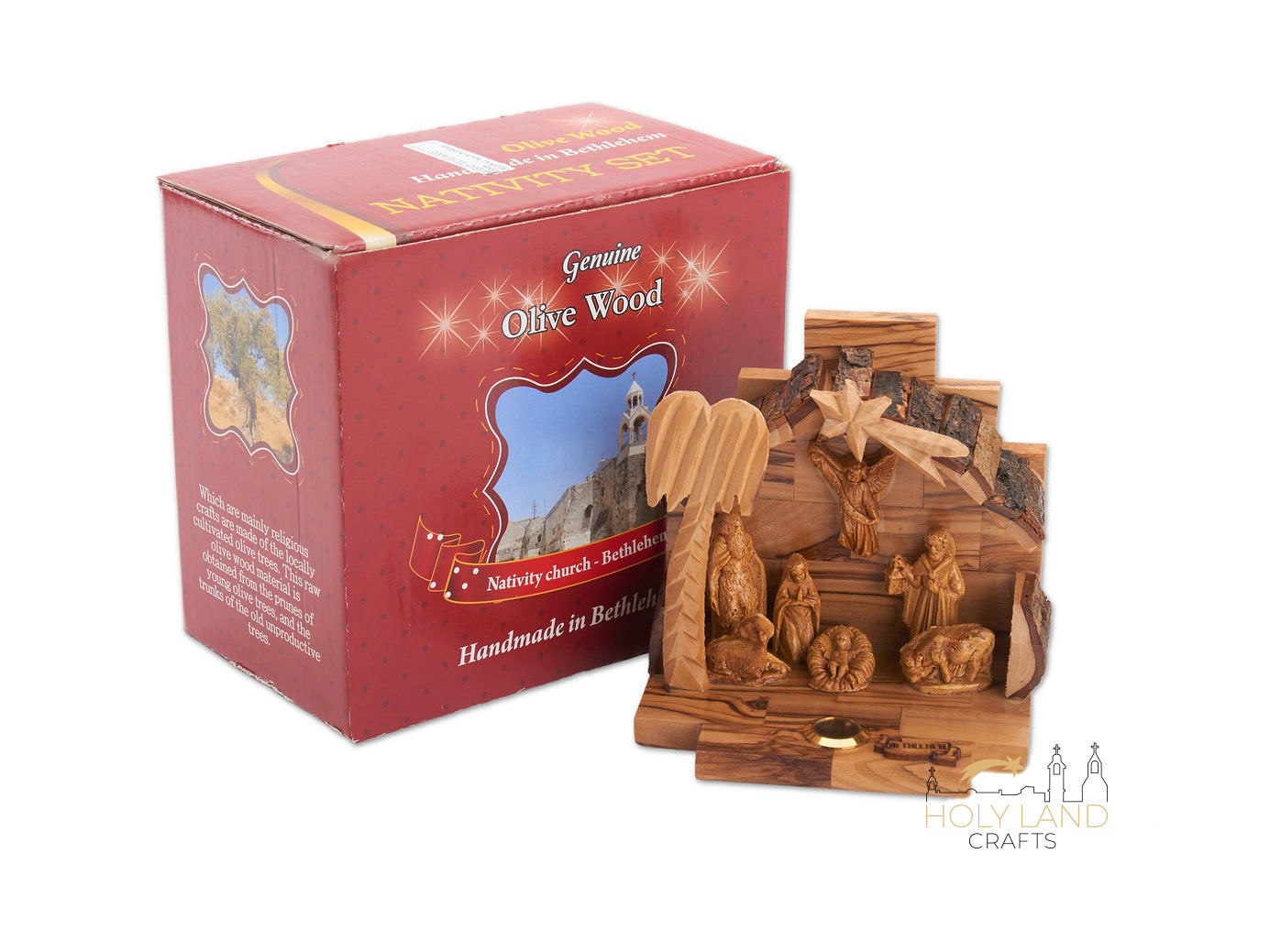 -Highly detailed authentic Olive Wood Nativity. On the floor is a glass filled with Holy Land Incense. - No two olive wood items are identical due to the natural coloring of the olive wood. We hand select special olive wood branches to create all of our designs. Please note that The olive wood Color & Appearance may change from piece to another - The Heartwood of the Olive Tree is a cream or yellowish brown, with darker brown or black contrasting streaks. Color tends to deepen with age. Olive wood sometimes figured with curly or wavy grain, burl, or wild grain. Nativity Dimension: 8 x 6 Inches